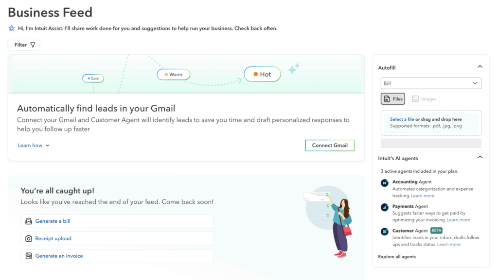 QuickBooks is rolling out some seriously cool tools. Their new AI Accounting Agent can auto-categorize transactions, the Finance Agent can flag insights in your numbers, and the Customer Hub pulls all your client info into one place. The Business Feed even shows you what the AI has already taken care of for you.